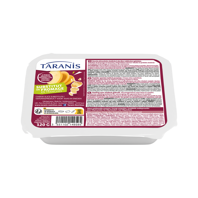 Taranis Sliced Cheese Substitute to żywność specjalnego przeznaczenia medycznego. Ten preparat o obniżonej zawartości białka ma zastąpić dostępny w sprzedaży ser w plastrach. Ten FSMS został opracowany specjalnie dla osób cierpiących na dziedziczne zaburzenia metaboliczne, takie jak fenyloketonuria, choroba syropu klonowego, homocystynuria i tyrozynemia, spowodowane genetycznym niedoborem enzymu lub transportera zaangażowanego w liczne szlaki metaboliczne.