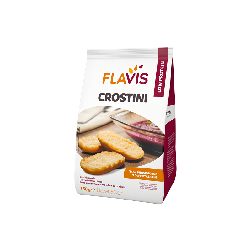 Klasyczne crostini chrupiące grzanki, do przekąszenia między posiłkami, same lub z ulubionymi dodatkami. Przeznaczone do postępowania dietetycznego u osób cierpiących na wrodzone zaburzenia metaboliczne, przewlekłą niewydolność nerek lub inne choroby wymagające diety niskobiałkowej.
